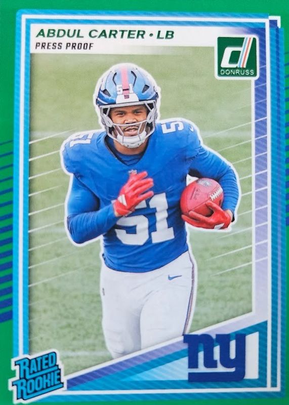 The Abdul Carter 2025 Donruss #315 Press Proof Green Rookie card in Raw condition has moved down -$0.03 (-1.5%) in the last 30 days and was last sold for $1.97 .