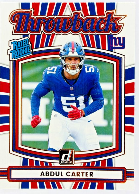 The Abdul Carter 2025 Donruss #49 Rated Rookies Throwback card in Raw condition has moved up $0.66 (+66.7%) in the last 30 days and was last sold for $1.65 .