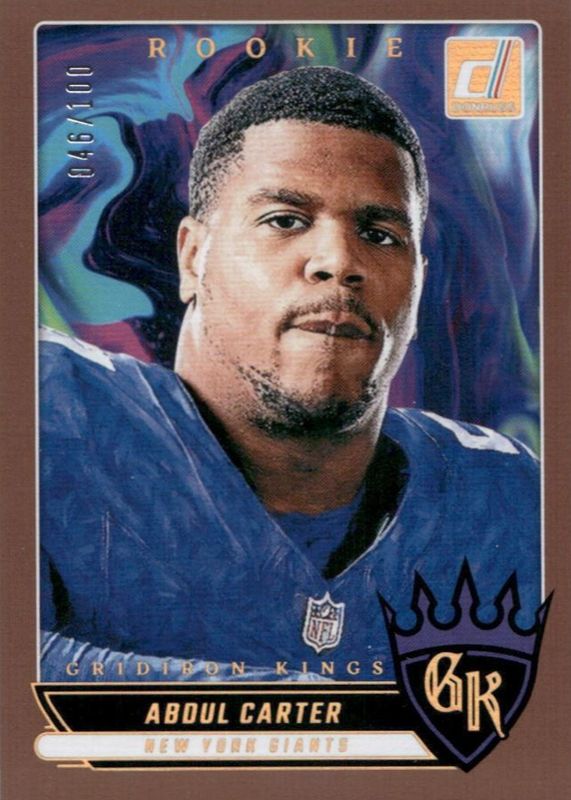 The Abdul Carter 2025 Donruss #9 Rookie Gridiron Kings - Studio Series /100 card in Raw condition has moved down -$6.00 (-60.1%) in the last 30 days and was last sold for $3.99 .