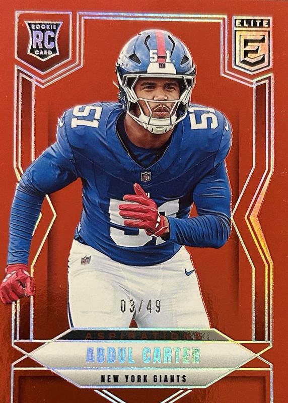 The Abdul Carter 2025 Elite #111 Aspirations (/49) Rookie card in Raw condition has not changed in price in the last 30 days and was last sold for $7.50 .