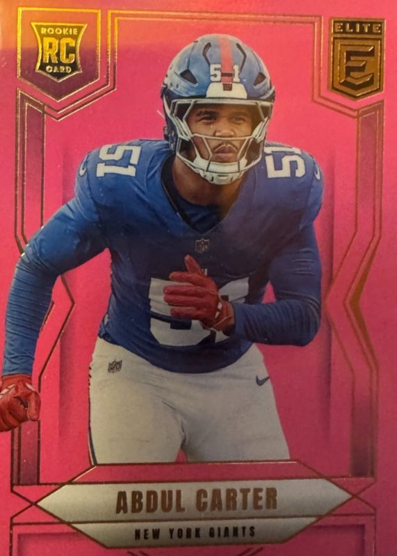 The Abdul Carter 2025 Elite #111 Pink Rookie card in Raw condition has moved up $1.50 (+42.9%) in the last 30 days and was last sold for $5.00 .