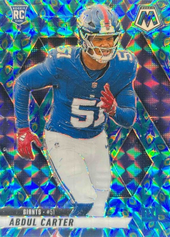 The Abdul Carter 2025 Mosaic #317 Choice Peacock /(SSP) Rookie card in Raw condition has moved down -$6.00 (-9.1%) in the last 30 days and was last sold for $60.00 .
