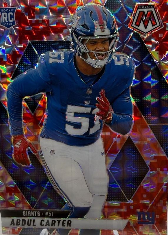 The Abdul Carter 2025 Mosaic #317 Red Camo Rookie card in Raw condition has moved up $3.12 (+146%) in the last 30 days and was last sold for $5.25 .