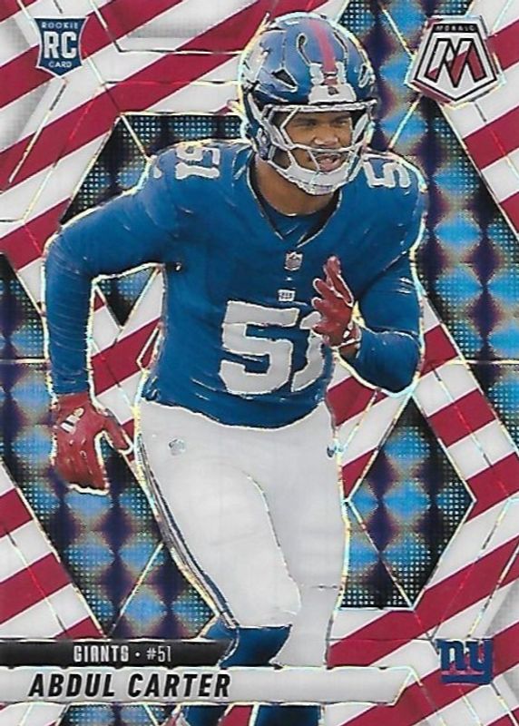 The Abdul Carter 2025 Mosaic #317 Red & White Stripe Rookie card in Raw condition has moved down -$0.01 (-0.2%) in the last 30 days and was last sold for $3.99 .