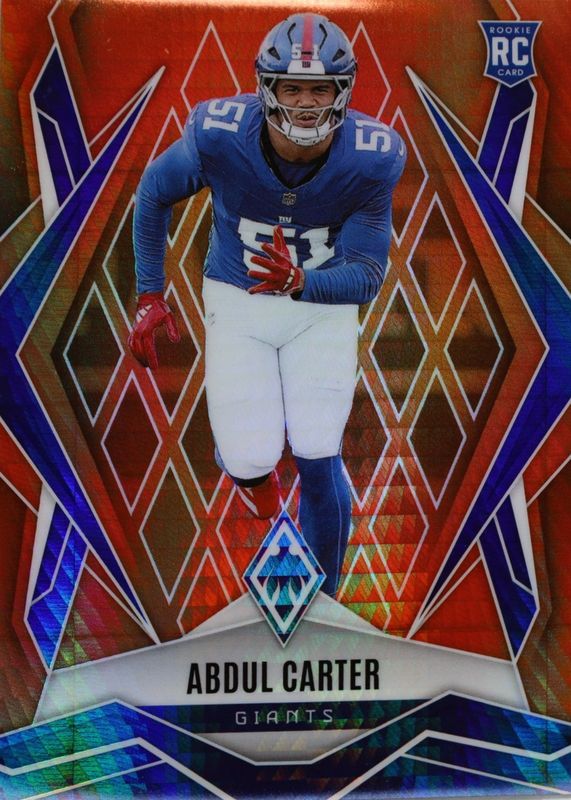 The Abdul Carter 2025 Phoenix #177 Orange Hyper /99 Rookie card in Raw condition has moved down -$1.75 (-50.0%) in the last 30 days and was last sold for $1.75 .