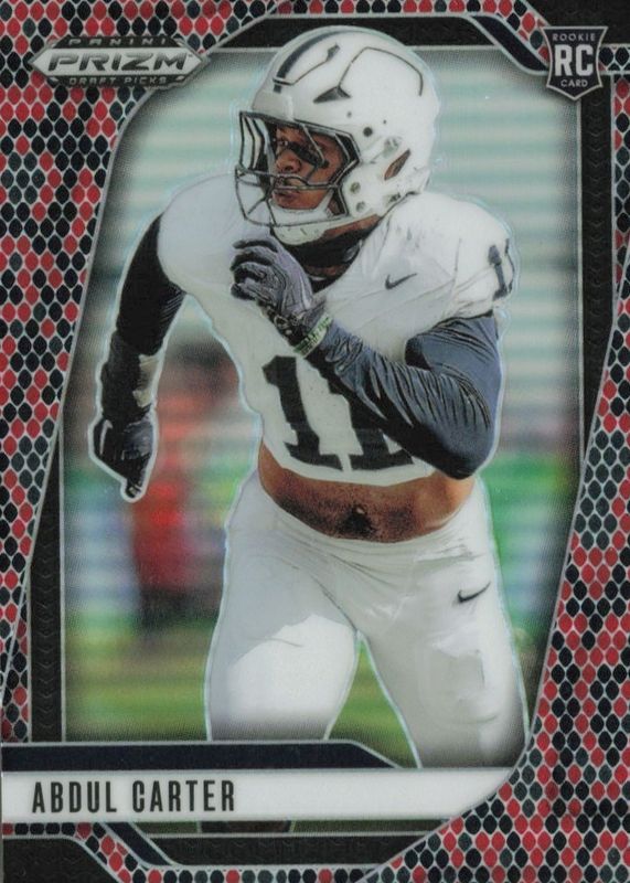 The Abdul Carter 2025 Prizm Draft Picks #102 Snakeskin /(SSP) Rookie card in Raw condition has not changed in price in the last 30 days and was last sold for $22.50 .