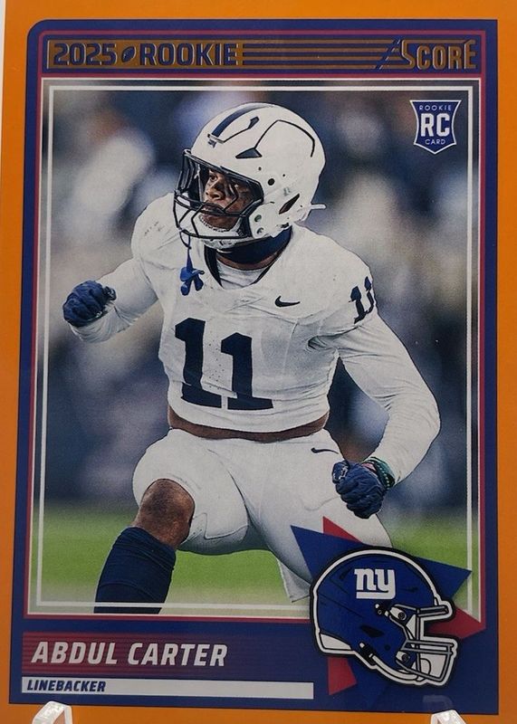 The Abdul Carter 2025 Score #16 Orange Rookie card in Raw condition has moved up $1.24 (+70.9%) in the last 30 days and was last sold for $2.99 .