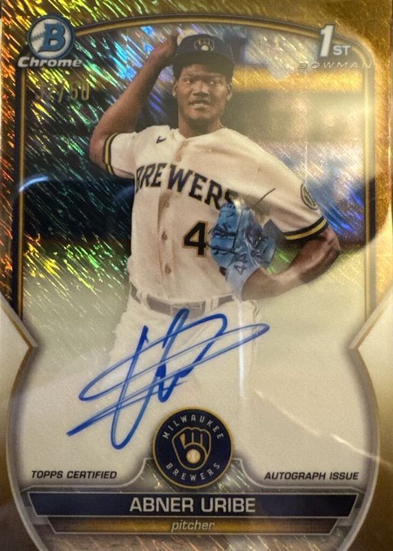 2023 Bowman Chrome Abner Uribe 1st Gold Shimmer Auto /50 Brewers