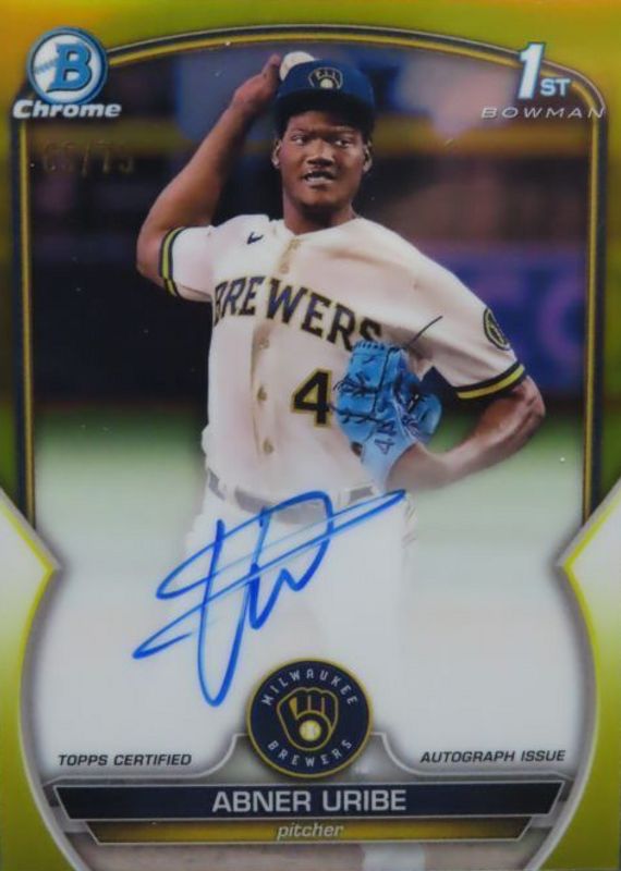 2023 Bowman Chrome Abner Uribe CPA-AU 1st Auto Yellow Refractor /75 Brewers🔥🔥