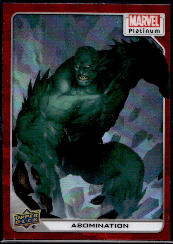 The Abomination 2023 Upper Deck Marvel Platinum #81 Red Rainbow card is 1 of 41 Abomination's card variations in the 2023 Upper Deck Marvel Platinum set being tracked by Sports Card Investor, including Base, Black Rainbow, Blue Rainbow, Blue Surge, and Purple Rainbow.
