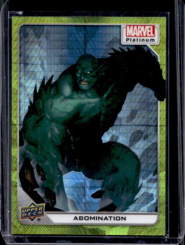 The Abomination 2023 Upper Deck Marvel Platinum #81 Yellow Spotlight /399 card is 1 of 41 Abomination's card variations in the 2023 Upper Deck Marvel Platinum set being tracked by Sports Card Investor, including Base, Black Rainbow, Blue Rainbow, Blue Surge, and Purple Rainbow.