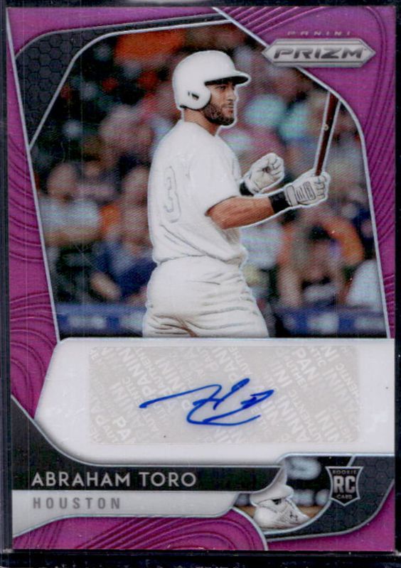 The Abraham Toro 2020 Prizm #RA-AT Rookie Autographs - Pink /50 card is 1 of 61 Abraham Toro's card variations in the 2020 Prizm set being tracked by Sports Card Investor, including Base, Blue, Carolina Blue, Cosmic Haze, and Green.