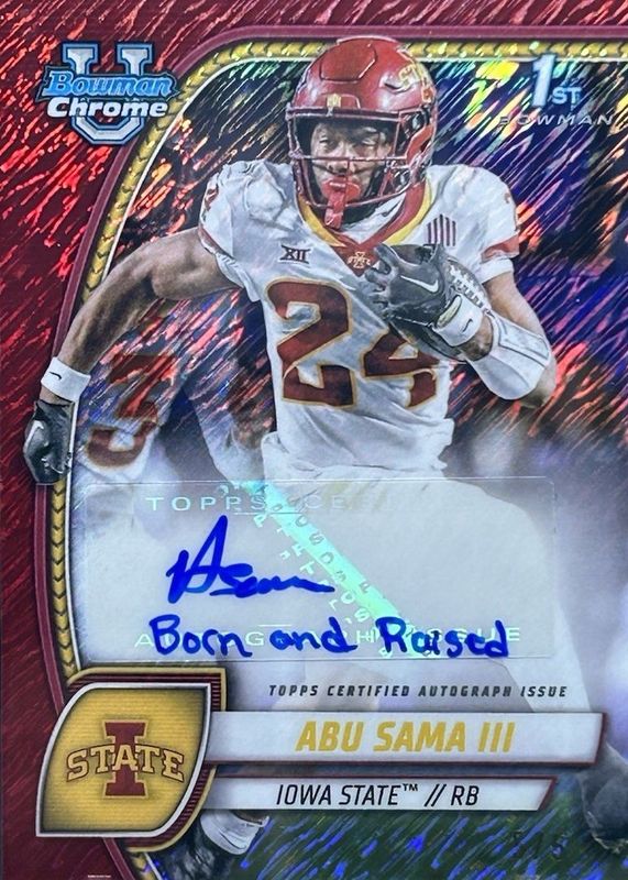 This card is 1 of 14 Abu Sama III's card variations in the 2024 Bowman Chrome University set being tracked by Sports Card Investor, including Prospect Auto (1st), Prospect Auto - Stealth Refractor (1st), Prospect Auto - Refractor /299 (1st), Prospect Auto - Fuchsia Refractor /150 (1st), and Prospect Auto - Green Refractor /99 (1st).