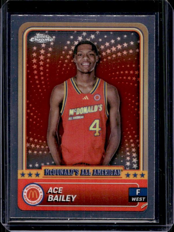 The Ace Bailey 2024 Topps Chrome McDonald's All-American #84 Base card is 1 of 112 Ace Bailey's card variations in the 2024 Topps Chrome McDonald's All-American set being tracked by Sports Card Investor, including #34 Base, #34 Blue RayWave Refractor, #84 Blue RayWave Refractor, #34 McDonald's Logo Refractor, and #84 McDonald's Logo Refractor.