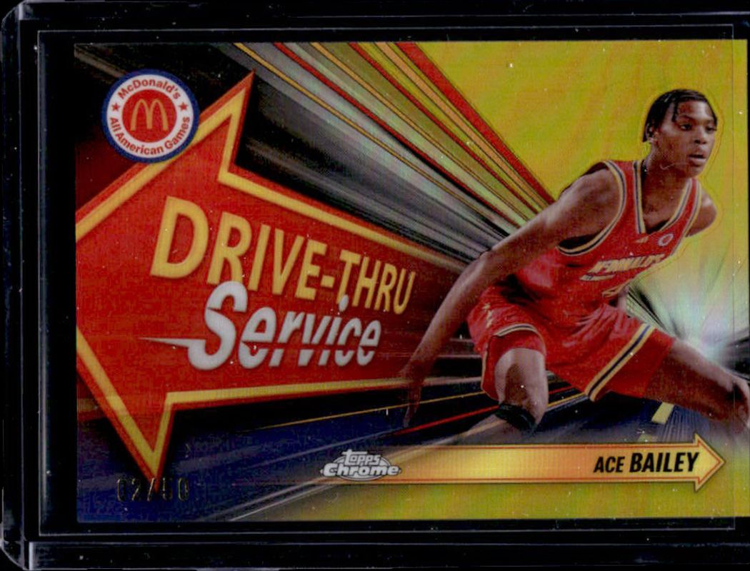 The Ace Bailey 2024 Topps Chrome McDonald's All-American #DTS-AIB Drive-Thru Service - Gold Refractor /50 card is 1 of 112 Ace Bailey's card variations in the 2024 Topps Chrome McDonald's All-American set being tracked by Sports Card Investor, including #84 Base, #34 Base, #34 Blue RayWave Refractor, #84 Blue RayWave Refractor, and #34 McDonald's Logo Refractor.