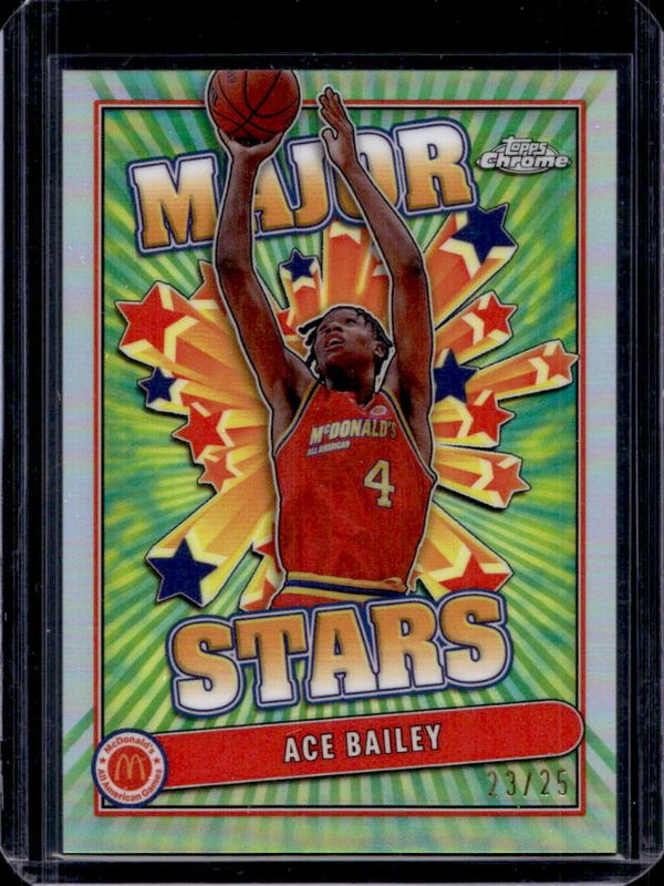 The Ace Bailey 2024 Topps Chrome McDonald's All-American #SES-AIB Major Stars - Tie-Dye Refractor /25 card is 1 of 112 Ace Bailey's card variations in the 2024 Topps Chrome McDonald's All-American set being tracked by Sports Card Investor, including #84 Base, #34 Base, #34 Blue RayWave Refractor, #84 Blue RayWave Refractor, and #34 McDonald's Logo Refractor.
