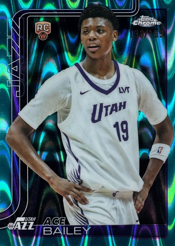 This card is 1 of 395 Ace Bailey's card variations in the 2025 Topps Chrome set being tracked by Sports Card Investor, including Base, Basketball Refractor, Box Set Refractor, Image Variation, and Lightboard Logo Refractor.