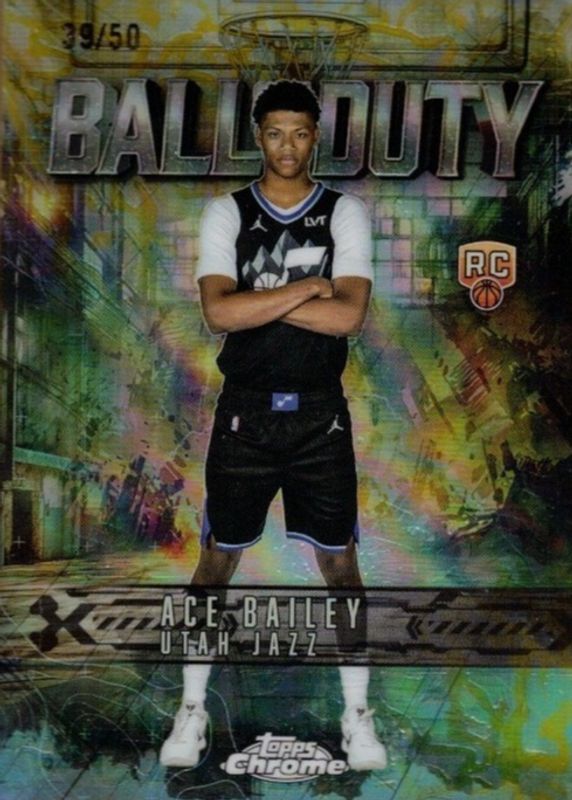 The Ace Bailey 2025 Topps Chrome #BD-24 Ball of Duty - Gold Refractor /50 Rookie card in Raw condition has moved up $5.01 (+10.0%) in the last 30 days and was last sold for $55.00 .