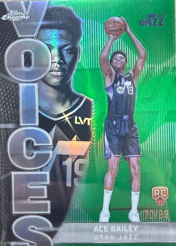 The Ace Bailey 2025 Topps Chrome #VS-10 Voices - Green Refractor /99 Rookie card in Raw condition has moved down -$12.34 (-24.7%) in the last 30 days and was last sold for $37.66 .