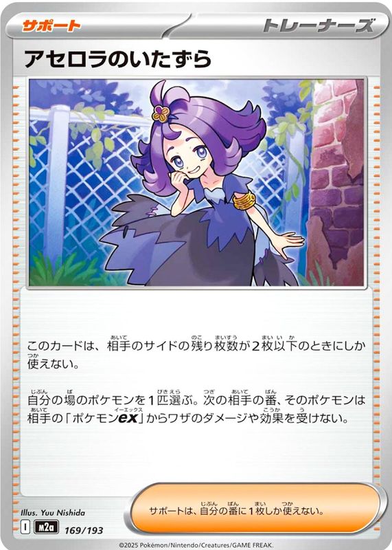 The Acerola's Mischief 2025 Japanese Mega: Mega Dream ex #169/193 Base card in Raw TCG (Near Mint) condition has not changed in price in the last 30 days and was last sold for $1.50 .