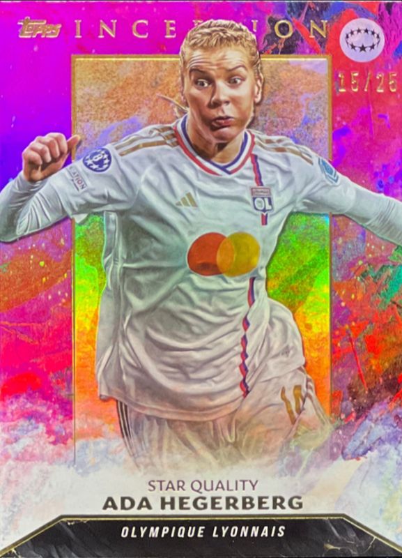 The Ada Hegerberg 2023 Topps Inception UEFA Club Competitions #43 Purple /25 card is 1 of 20 Ada Hegerberg's card variations in the 2023 Topps Inception UEFA Club Competitions set being tracked by Sports Card Investor, including Base, #43 Base, #43 Rainbow /150, Rainbow /150, and Aqua /125.