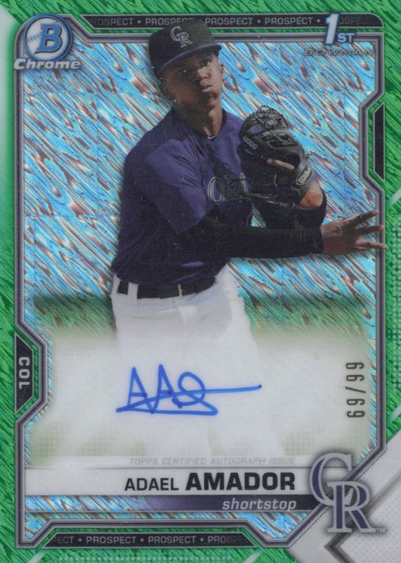 This card is 1 of 16 Adael Amador's card variations in the 2021 Bowman set being tracked by Sports Card Investor, including Chrome Prospect Auto (1st), Chrome Prospect Auto - Refractor /499 (1st), Chrome Prospect Auto - Speckle Refractor /299 (1st), Chrome Prospect Auto - Purple Refractor /250 (1st), and Chrome Prospect Auto - Blue Refractor /150 (1st).