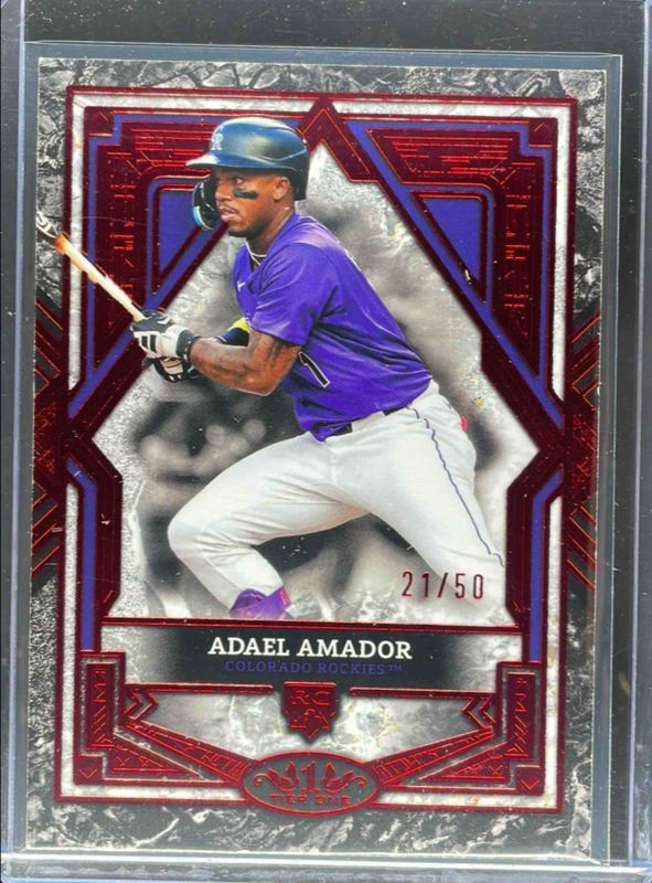 The Adael Amador 2025 Topps Tier One #81 Base Tier 3 - Red Foil /50 Rookie card is 1 of 18 Adael Amador's card variations in the 2025 Topps Tier One set being tracked by Sports Card Investor, including Base Tier 3, Base Tier 3 - Bronze Foil, Rookie Relics, Tier One Bat Knobs, and Base Tier 3 - Blue Foil /125.