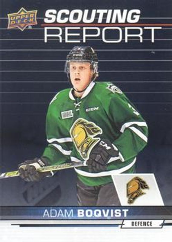 The Adam Boqvist 2018 Upper Deck CHL #SR-15 Scouting Report card is 1 of 12 Adam Boqvist's card variations in the 2018 Upper Deck CHL set being tracked by Sports Card Investor, including Base, Silver, Star Rookies UD Exclusives /100, Star Rookies Midnight /25, and Star Rookies High Gloss /10.