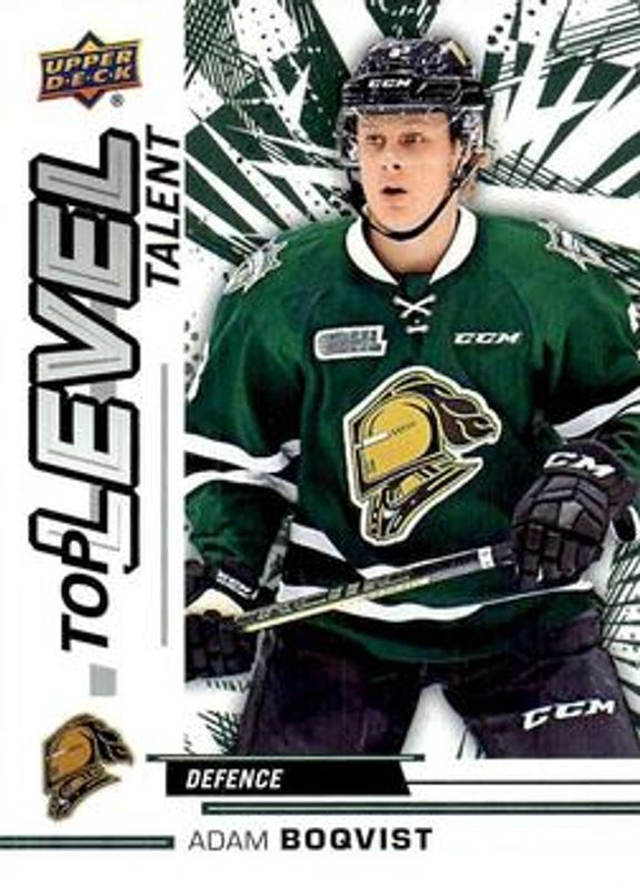 The Adam Boqvist 2018 Upper Deck CHL #TL-16 Top Level Talent card is 1 of 12 Adam Boqvist's card variations in the 2018 Upper Deck CHL set being tracked by Sports Card Investor, including Base, Silver, Star Rookies UD Exclusives /100, Star Rookies Midnight /25, and Star Rookies High Gloss /10.