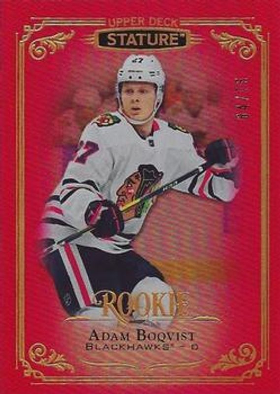 The Adam Boqvist 2019 Upper Deck Stature #102 Red /75 Rookie card is 1 of 27 Adam Boqvist's card variations in the 2019 Upper Deck Stature set being tracked by Sports Card Investor, including Base /399, Autographs /199, Green /149, Autographs Green /85, and Portrait Variant /85.