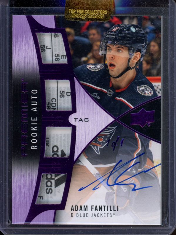 The Adam Fantilli 2023 Upper Deck Premier #PRA-AF 2023 Premier Rookie Auto - Tag Patch /1 card is 1 of 42 Adam Fantilli's card variations in the 2023 Upper Deck Premier set being tracked by Sports Card Investor, including Base /399, Bronze /199, Gold /65, Ruby /49, and Rose Gold /25.