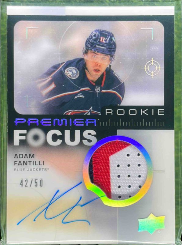 The Adam Fantilli 2023 Upper Deck Premier #PFR-AF Premier Focus Auto Patch Rookies /50 card is 1 of 42 Adam Fantilli's card variations in the 2023 Upper Deck Premier set being tracked by Sports Card Investor, including Base /399, Bronze /199, Gold /65, Ruby /49, and Rose Gold /25.