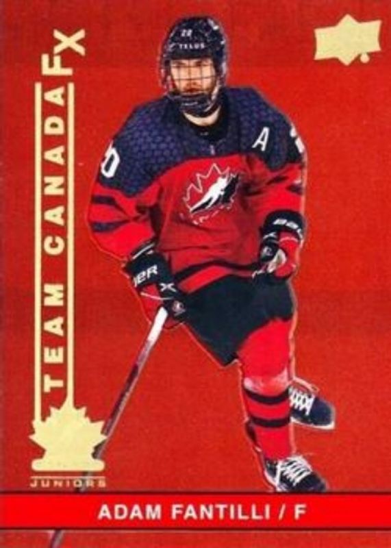 The Adam Fantilli 2023 Upper Deck Team Canada Juniors #FX-10 Team Canada FX Rookie card is 1 of 84 Adam Fantilli's card variations in the 2023 Upper Deck Team Canada Juniors set being tracked by Sports Card Investor, including #129 Base, #75 Base, #9 Base, #75 Clear Cut, and #129 Clear Cut.
