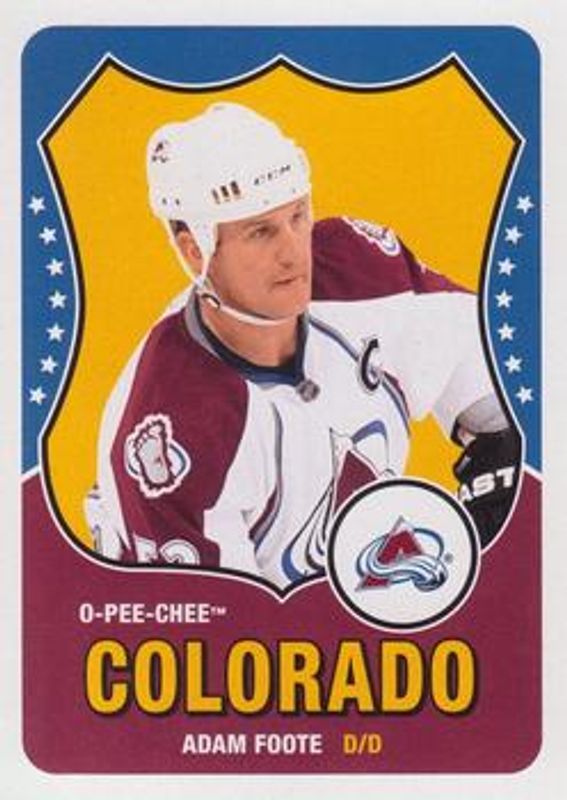 The Adam Foote 2010 O-Pee-Chee #156 Retro card is 1 of 5 Adam Foote's card variations in the 2010 O-Pee-Chee set being tracked by Sports Card Investor, including Base, Retro Blank Back, Retro Rainbow, and Retro Black Rainbow /100.