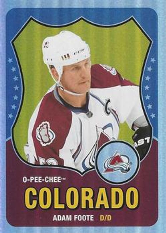 The Adam Foote 2010 O-Pee-Chee #156 Retro Rainbow card is 1 of 5 Adam Foote's card variations in the 2010 O-Pee-Chee set being tracked by Sports Card Investor, including Base, Retro, Retro Blank Back, and Retro Black Rainbow /100.