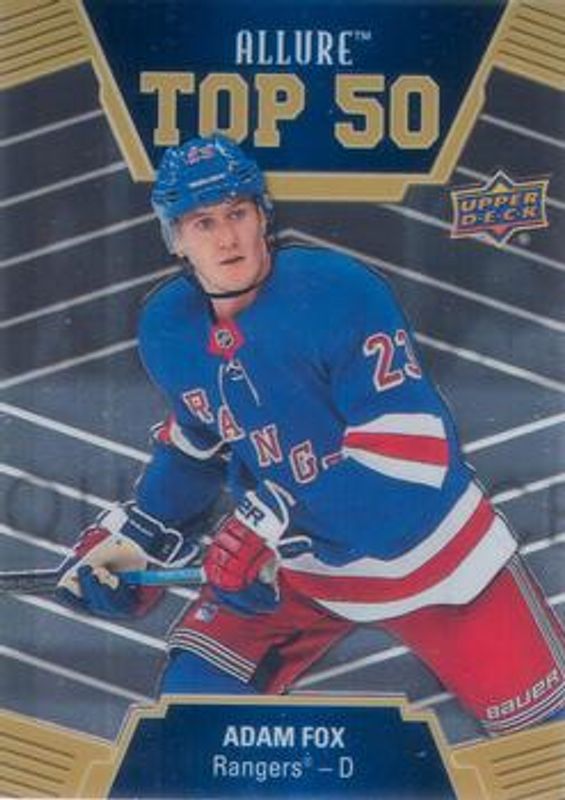 The Adam Fox 2019 Upper Deck Allure #T50-5 Top 50 Rookie card is 1 of 32 Adam Fox's card variations in the 2019 Upper Deck Allure set being tracked by Sports Card Investor, including Base, Pewter, Red Rainbow, White Rainbow, and Yellow Taxi.