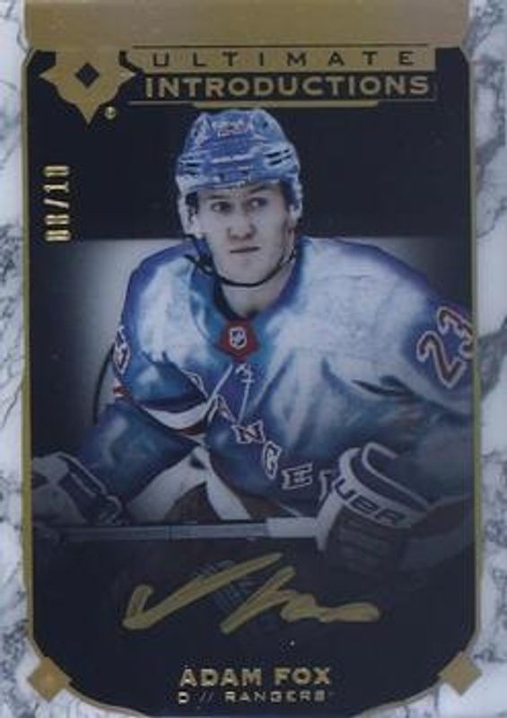 The Adam Fox 2021 Upper Deck Ultimate Collection #UI-55 2019 Upper Deck Ultimate Collection Update: Ultimate Introductions Onyx Black Autographs /10 card is 1 of 12 Adam Fox's card variations in the 2021 Upper Deck Ultimate Collection set being tracked by Sports Card Investor, including Base /299, Gold /35, Purple /15, Black /5, and 2019 Upper Deck Ultimate Collection Update: Ultimate Introductions Gold Autographs.