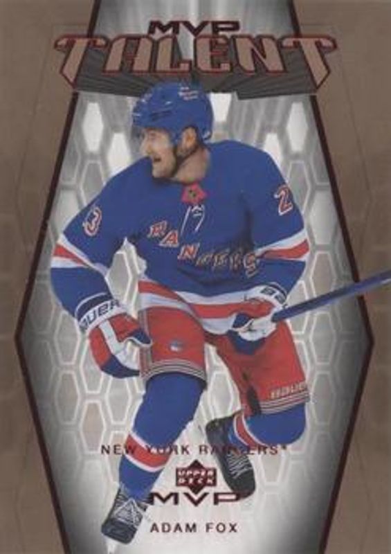 The Adam Fox 2023 Upper Deck MVP #MT-56 20th Anniversary card is 1 of 17 Adam Fox's card variations in the 2023 Upper Deck MVP set being tracked by Sports Card Investor, including Base, Gold Script, Ice Battles, Silver Script, and Super Script /25.