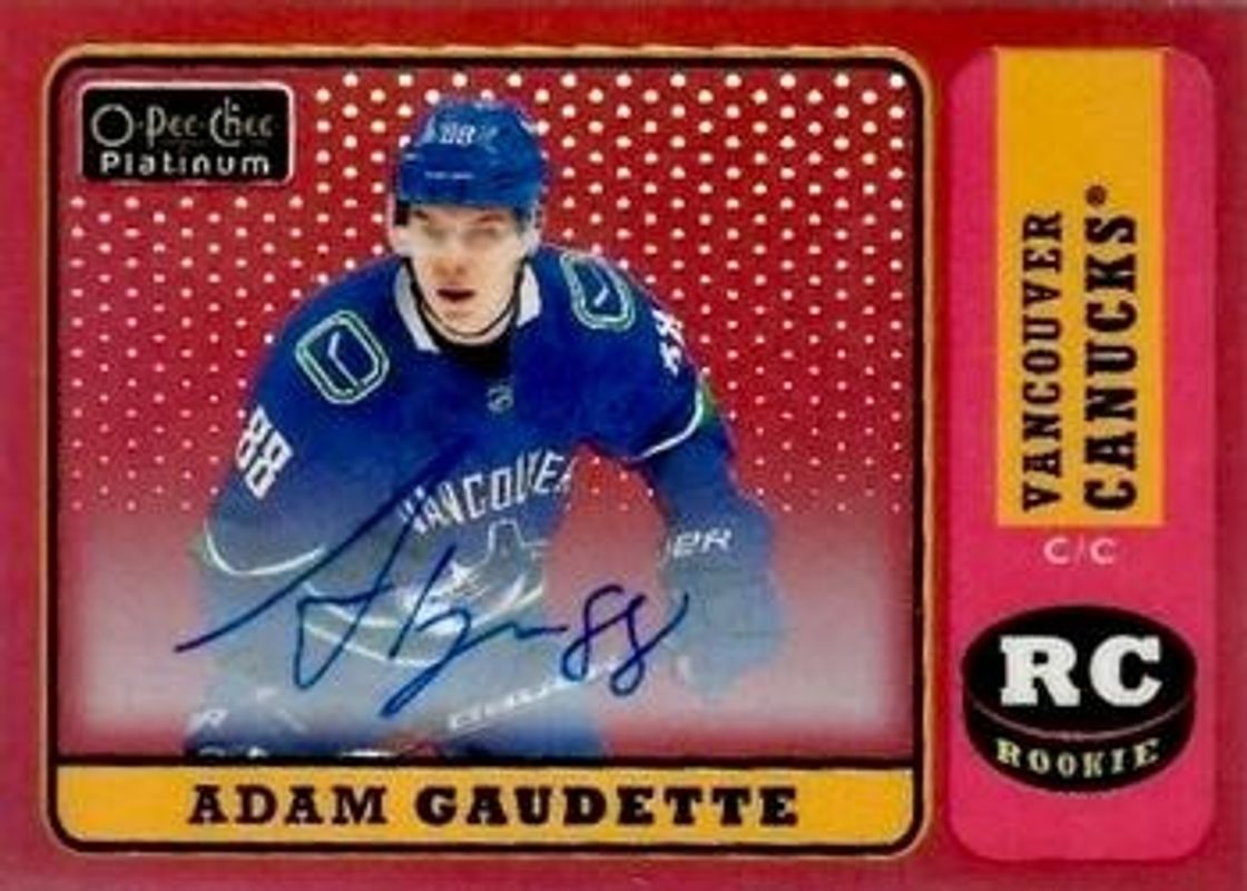 The Adam Gaudette 2019 O-Pee-Chee Platinum #R-68 2018-19 O-Pee-Chee Platinum Update I - Rookie Autos /50 card is 1 of 10 Adam Gaudette's card variations in the 2019 O-Pee-Chee Platinum set being tracked by Sports Card Investor, including 2018-19 O-Pee-Chee Platinum Update I - Retro Red Rainbow Autos, 2018-19 O-Pee-Chee Platinum Update I - Rookie Autos - Rainbow Color Wheel, 2018-19 O-Pee-Chee Platinum Update I - Rookie Autos - Violet Pixels, 2018-19 O-Pee-Chee Platinum Update I - Rookie Autos /50, and 2018-19 O-Pee-Chee Platinum Update I - Rookie Autos - Red Prism /50.