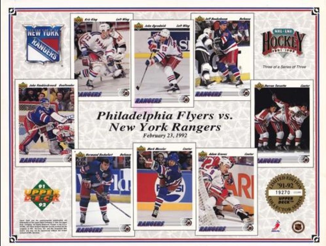 Adam Graves / Darren Turcotte / Jeff Beukeboom / John Ogrodnick / John Vanbiesbrouck / Kris King / Mark Messier / Normand Rochefort 1991 Upper Deck #3 Promotional Sheets /21500 RAW Price Guide