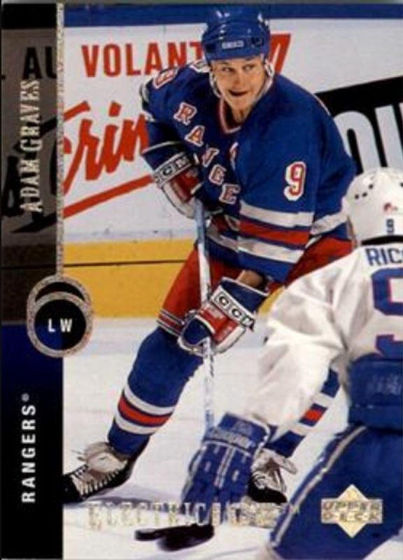 The Adam Graves 1994 Upper Deck #10 Electric Ice card is 1 of 9 Adam Graves' card variations in the 1994 Upper Deck set being tracked by Sports Card Investor, including #10 Base, #IG7 Ice Gallery, #R38 Predictors Retail, #R5 Predictors Retail, and #R38 Predictors Retail Exchange.