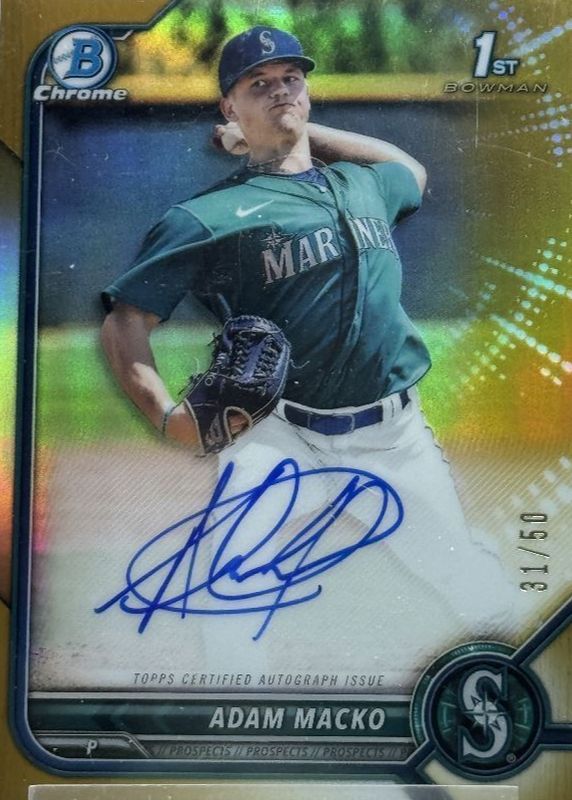 The biggest 30-day change Adam Macko cards are 2022 Bowman #CPA-AM Chrome Prospect Auto - Refractor /499 (1st), 2022 Bowman #CPA-AM Chrome Prospect Auto - Purple Refractor /250 (1st), and 2022 Bowman #CPA-AM Chrome Prospect Auto (1st).