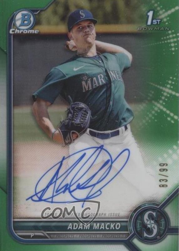 2022 Bowman Chrome Prospect Auto Adam Macko Green Refractor /99 Mariners 1st