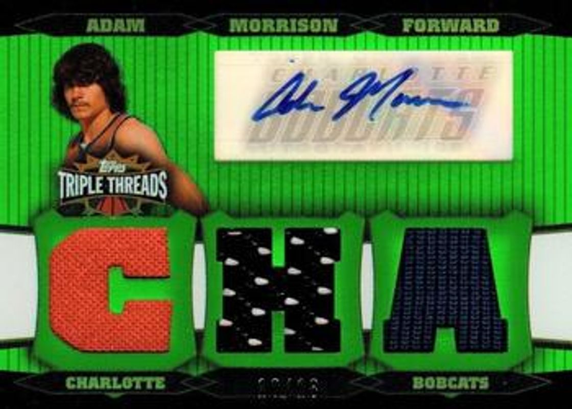 The Adam Morrison 2006 Topps Triple Threads #TTRA-2 Relics Autographs Emerald /18 Rookie card is 1 of 54 Adam Morrison's card variations in the 2006 Topps Triple Threads set being tracked by Sports Card Investor, including Base /99, Emerald /50, Gold /25, Sapphire /10, and Platinum /1.