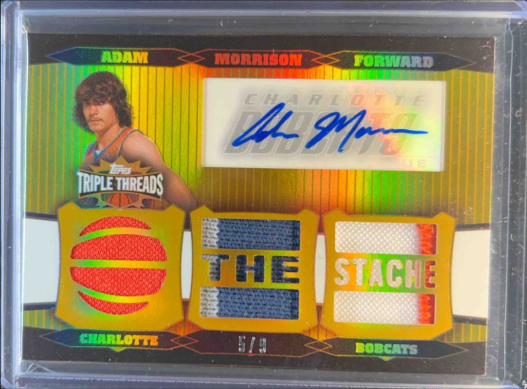The Adam Morrison 2006 Topps Triple Threads #TTRA-3 Relics Autographs Gold /9 Rookie card is 1 of 54 Adam Morrison's card variations in the 2006 Topps Triple Threads set being tracked by Sports Card Investor, including Base /99, Emerald /50, Gold /25, Sapphire /10, and Platinum /1.