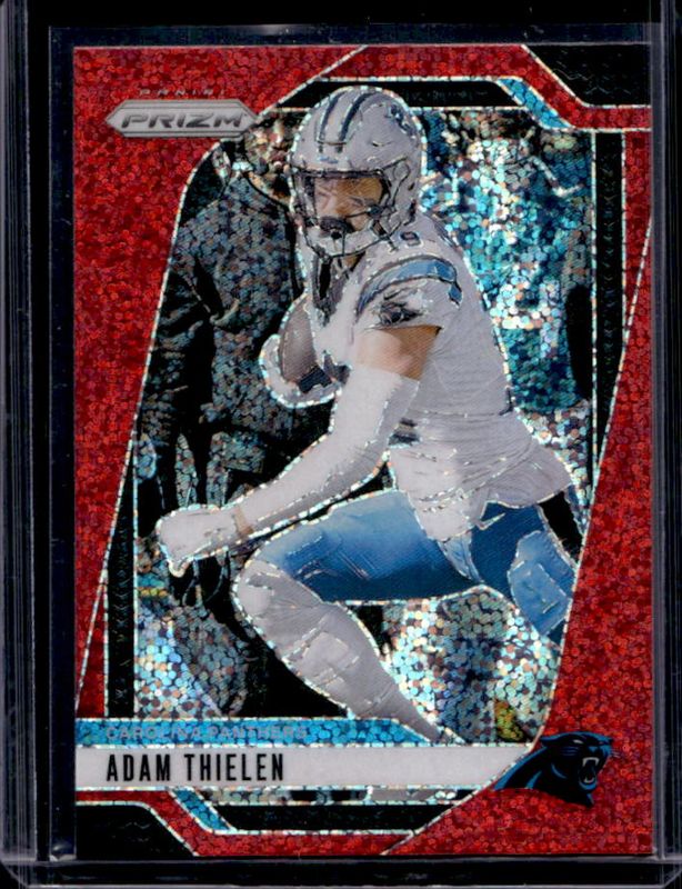 The Adam Thielen 2024 Prizm #39 Red Sparkle /(SSP) card is 1 of 83 Adam Thielen's card variations in the 2024 Prizm set being tracked by Sports Card Investor, including Base, Choice Blue Yellow Green, Choice Silver, Disco, and Green.