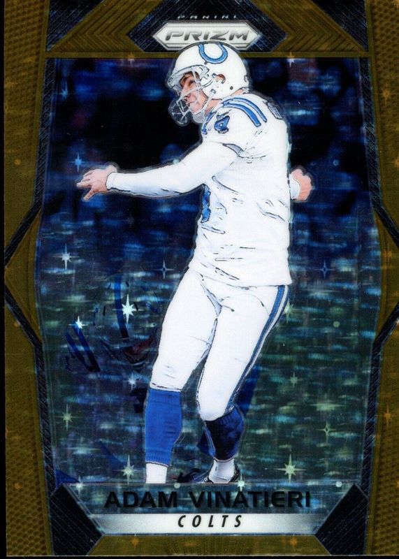 This card is 1 of 5 Adam Vinatieri's card variations in the 2017 Prizm set being tracked by Sports Card Investor, including White Sparkle /(SSP), Gold /10, Gold Vinyl /5, and Black Finite /1.