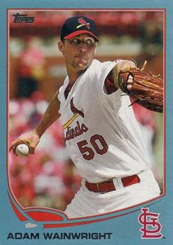 The Adam Wainwright 2013 Topps #50 Blue card is 1 of 20 Adam Wainwright's card variations in the 2013 Topps set being tracked by Sports Card Investor, including Base, Silk Collection /50, Own The Name /1, Emerald Foil, and Purple.