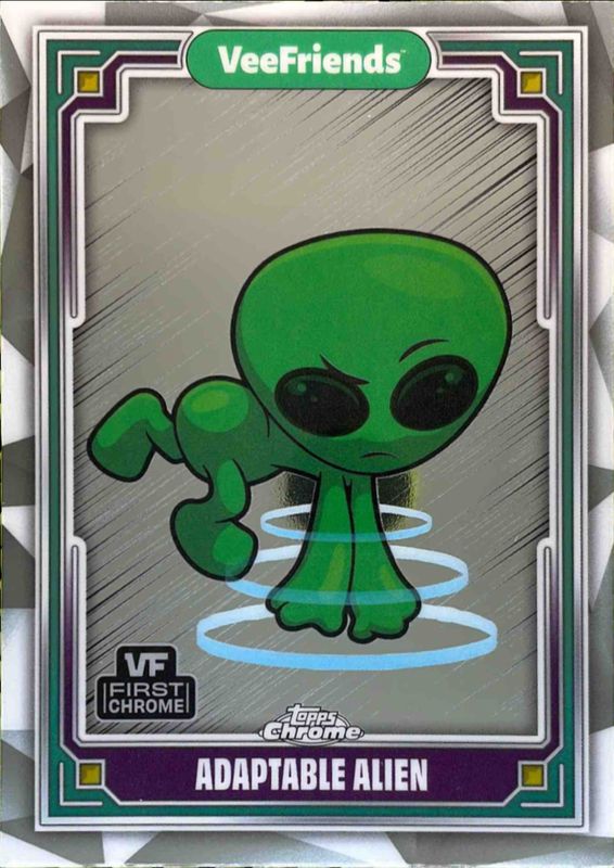 The Adaptable Alien 2025 Topps Chrome VeeFriends #6 Base card is 1 of 21 Adaptable Alien's card variations in the 2025 Topps Chrome VeeFriends set being tracked by Sports Card Investor, including Refractor, Yellow Refractor, Shimmer Refractor /250, RayWave Refractor /199, and Wave Refractor /150.