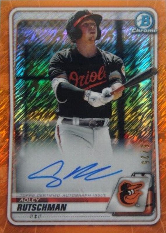 The Adley Rutschman 2020 Bowman #CPA-AR Chrome Prospect Auto - Orange Shimmer Refractor /25 card in Raw condition has not changed in price in the last 30 days and was last sold for $255.00 .